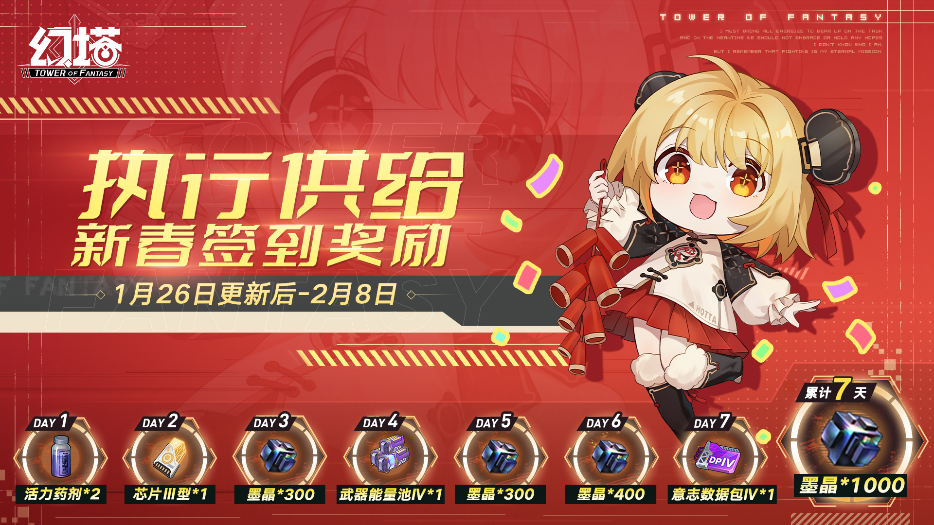 1月30日23:59:59-2月8日23:59:59期间,登录游戏即送【Mi-a拜年头像】、【联合补给芯片I×3】、【活力药剂×1】、【芯片III型×1】!